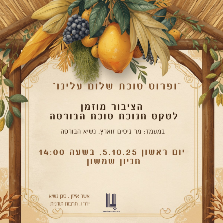 הציבור מוזמן לטקס חנוכת סוכת הבורסה שיערך ביום ראשון 5.10.25 בשעה 14:00 בחניון שמשון במעמד מר ניסים זוארץ, נשיא הבורסה.